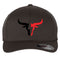 3D looking suede-like feel textured black and red Bullhead graphic design printed on caps.